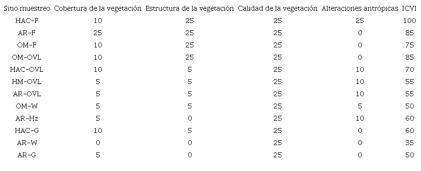 Los sitios de cobertura forestal registraron valores importantes de riqueza, diversidad, un componente estructural de la vegetación bueno y calidades de vegetación (ICVI) óptimas y buenas, a pesar de los procesos de intervención que se dan en algunas zonas. Resalta, además, el sitio OM-OVL, que corresponde a un arbustal con condiciones óptimas, constituyendo un sitio de particular interés. Las zonas de pantano (HAC-OVL, HM-OVL, AR-OVL, OM-W, AR-Hz) aunque tienen bajos valores de riqueza y diversidad, presentan una buena calidad según el ICVI; estas integran áreas importantes para reducir la frecuencia y severidad de las inundaciones, teniendo en cuenta que las raíces de la vegetación que crecen en estas áreas de transición (zonas pantanosas), reducen la velocidad de los flujos de agua y refuerzan la estabilidad de las orillas, evitando la erosión y resultando en una medida importante para reducir efectos como los del cambio climático, que tanto están afectando estos ecosistemas (Cuadro 9).
