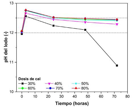 Las dosis de cal a aplicar para alcanzar estos pH se determinaron experimentalmente por medio de una prueba de dosificación antes de realizar el experimento de higienización. Esto se hizo con el objetivo de conocer mejor la respuesta de las muestras al tipo de cal específico usado en el experimento. Se seleccionaron los valores de pH de 12.0 y 12.5 por ser el primero el mínimo teórico recomendado para una higienización completa del lodo de PTAR (Bittencourt et al., 2021), considerando también un valor superior (12.5) como margen de seguridad para garantizar el mantenimiento de un pH igual o superior a 12.0 durante todo el período del experimento (30 días). Las dosis de cal se expresan en masa de cal por masa de lodo seco.