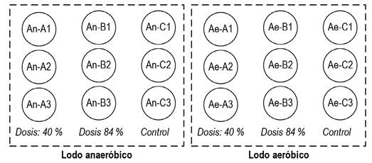Según se observa en la Figura 2, el experimento se realizó para dos muestras de lodo: anaeróbico y aeróbico (ver sus características en el Cuadro 1). Cada uno fue evaluado bajo tres condiciones: (i) control, una muestra para la cual no se aplicó cal y se realizó el seguimiento de los parámetros de control en el tiempo del experimento; (ii) muestra con dosis de cal de 40 % (masa de cal viva/masa de lodo seco); y (iii) muestra con dosis de 84%.