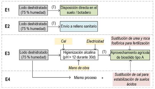 El Cuadro 6 presenta los flujos de materia y energía (inventario) definidos para las simulaciones comparativas de ACV de los escenarios modelados (Figura 3). En el caso de E1 y E2, se consideró un transporte de 50 t∙km y la disposición de una tonelada de lodo (75 % de humedad) en un relleno sanitario y en condiciones no sanitarias (botadero), respectivamente.