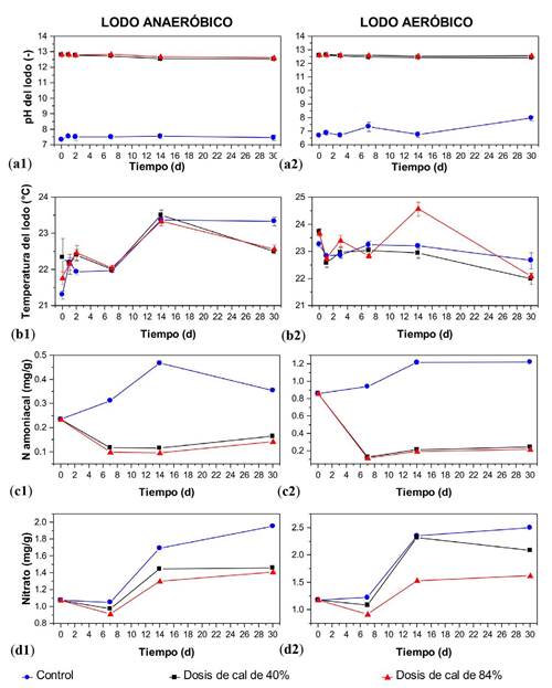 Con respecto a la Figura 4, es posible observar que ambos lodos presentaron un comportamiento similar para las distintas variables analizadas. Por ejemplo, en el caso del pH (Figura 4a1 y a2), este pudo mantenerse por encima de 12 unidades a lo largo de los 30 días, para ambas dosis de cal (40 % y 84 %), muy superior al control que varió entre 7 y 8 en ambos lodos. Llama la atención que ambas dosis presentaron un comportamiento equivalente, la dosis más elevada no tuvo un pH significativamente mayor a lo largo del tiempo, lo cual confirma que con una dosis de 40 % sería suficiente para lograr el biosólido tipo A. Con respecto a la temperatura (Figura 4b1 y b2), no se presentó una diferencia apreciable entre las muestras encaladas y los controles (a diferencia del pH), manteniéndose cercana a la temperatura ambiente del laboratorio.