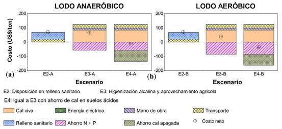 Según se observa en la Figura 5, para el lodo anaeróbico (a), el costo de la disposición en el relleno sanitario (E2-A) sería de aproximadamente USD 69.4/tonLH, mientras que el costo de implementación del proceso de higienización alcalina y comercialización sin valorización de la cal (E3-A) tendría un costo neto de aproximadamente USD 66.2/tonLH, un 4.6 % menor. Si además se considera el ahorro de cal agrícola (apagada) para un suelo ácido (E4-A), el costo neto del lodo pasaría a ser negativo, con un valor de casi -USD 11.0/tonLH. Para este lodo, los ahorros de nutrientes (E3) y de cal (E4) compensan los sobrecostos generados por el proceso de higienización, haciendo que dicha opción sea más atractiva que la disposición en el relleno sanitario.