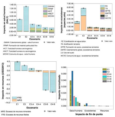 La Figura 6 muestra que E2 resulta ser el peor escenario por los impactos en la salud huma-
