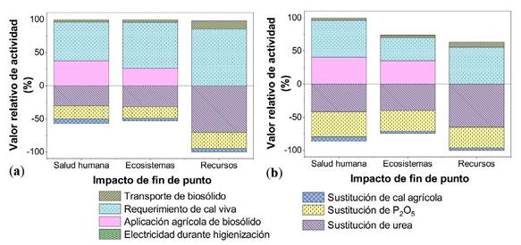Al considerar las ventajas ambientales, el ACV mostró que el aprovechamiento del lodo después de ser higienizado también es preferible a su disposición en el relleno sanitario autorizado y al entierro descontrolado o envío a un botadero clandestino. A pesar de los impactos relacionados con el consumo de materiales como la cal, o las emisiones de NH3 y otros gases a la atmósfera durante el proceso de higienización alcalina y la aplicación en la agricultura del biosólido, este impacto es compensado por la sustitución de cal agrícola (cal apagada para el control del pH) y por la sustitución de urea y P2O5.