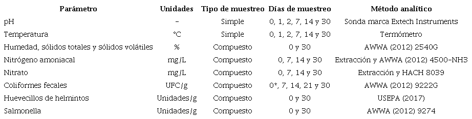 Los análisis de caracterización (Cuadro 1) fueron realizados en el Centro de Investigaciones Agronómicas de la Universidad de Costa Rica. Después de secar la muestra a 80 °C y pasarla a través de una criba de 1.0 mm, los análisis se realizaron en duplicado; se muestra el valor promedio. Los parámetros de P, Ca, Mg, K, S, Fe, Zn, Mn y B fueron determinados por medio de muestras de 0.5 g que fueron digeridas con ácido nítrico concentrado y analizadas por medio de espectrometría de emisión atómica con plasma acoplado inductivamente (ICP-OES). Los valores de carbono y nitrógeno se establecieron en un auto analizador por combustión seca según el principio de combustión seca de Dumas, con muestras de 80-100 mg. Los parámetros microbiológicos fueron analizados de acuerdo con los procedimientos de AWWA (2012).