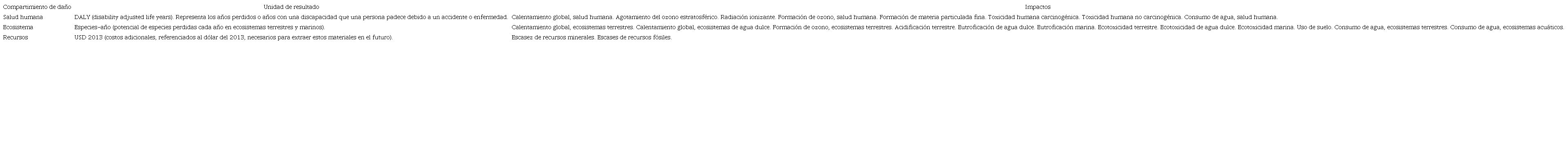 En el caso de la evaluación de los impactos ambientales se consideró el modelo Recipe 2016 (Huijbregts et al., 2017), de tipo endpoint con una perspectiva jerárquica, debido a su amplio uso en estudios de ACV con PTAR y acatando las recomendaciones de la literatura en la materia (Corominas et al., 2020). Este modelo permite calcular un total de 22 impactos a partir de los datos del inventario. Estos impactos se agrupan s en tres grandes compartimientos de daño: salud humana, ecosistemas y recursos. El detalle se observa en el Cuadro 4.