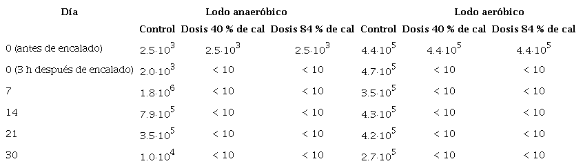 En el caso del lodo aeróbico, las muestras dieron negativo en huevecillos de helmintos y en salmonella desde el día cero (antes del proceso de encalado), por lo que este análisis no se repitió para las muestras posteriores. En el caso de la muestra de lodo anaeróbico, la cantidad de huevecillos de helmintos fue de 142 en el día 0, y bajó a no detectable en las tres muestras (control, dosis de cal de 40 % para alcanzar un pH de 12.0 y dosis de cal de 84 % para llegar a un pH de