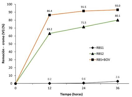 Por último, el sistema RBS1 presenta los menores porcentajes de remoción de cromo (VI), con valores que van desde 0.2 % = 12 h, 0.6 % = 24 h, 2.6 % = 36 h. Este resultado no sorprende, ya que dicho sistema no contó con componente alguno (BOV y BRCrVI) que permita la remoción de cromo (VI) de forma directa o en combinación. Sin embargo, se asume que los valores mínimos de remoción obtenidos se deben, básicamente, al efecto reductor del agua residual de curtiembre, es decir, a la presencia de bacterias autóctonas en el agua residual en estudio, que posibilitaron disminuir la concentración del cromo (VI) durante el tiempo en el cual el sistema operaba.