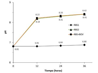 Los cambios de pH en RBS2 y RBS+BOV aumentaron a medida que transcurría el tiempo de tratamiento, con excepción de RBS1, donde los cambios no fueron significativos (Figura 3). Por otro lado, la prueba estadística (Tukey) arrojó que no hubo diferencia significativa en el aumento de pH entre RBS2 y RBS+BOV, pues estos tuvieron un mismo comportamiento. Los resultados muestran que la BOV no participa en los cambios de pH en los sistemas y que las BRCrVI fueron las responsables de ellos. Dicho hallazgo es contrastado con lo descrito por Panigatti et al. (2012), quienes evidenciaron que el aumento de pH de un medio se atribuye al crecimiento bacteriano. Las bacterias, a medida que biodegradan los sustratos presentes del medio, forman en el proceso compuestos alcalinos, en consecuencia, aumentan el pH del medio.