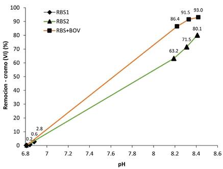 El sistema RBS+BOV obtuvo el mayor porcentaje de remoción de cromo (VI) (93 %), seguido del RBS2 (80.1 %) y RBS1 (2.6 %). Ello implica que la BOV tiene una participación removedora de cromo (VI), de forma independiente: 12.9 % y 90.4 %, si se compara con los otros 2 sistemas.