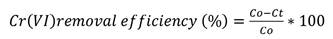 Los porcentajes de remoción de cromo (VI) se determinaron utilizando la Ecuación 1 (Shang et al., 2017). Esta también fue adaptada para establecer los porcentajes de remoción de DQO y SST.