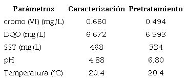Se tomaron muestras del agua residual para obtener los valores de caracterización de los parámetros en estudio (cromo (VI), DQO, SST, pH, temperatura). El manejo de las muestras y la determinación de sus valores se describen en el inciso 2.7 y los resultados se muestran en el Cuadro 1.