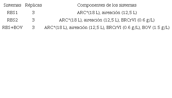 Las BRCrVI se obtuvieron de conformidad con lo empleado por Zhao et al. (2012). Estas fueron centrifugadas a 6 000 rpm, a 4 °C, por 5 minutos. Del volumen total de 3 000 mL del aumento, se obtuvo 60.3 g de BRCrVI. Finalmente, las BRCrVI fueron integradas a los sistemas RBS2 y RBS+BOV a una concentración de biomasa microbiana de 0.6 g/ L.