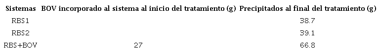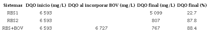 Por otro lado, se ha logrado evidenciar que la BOV incorporada al sistema RBS+BOV, no provoca un aumento de la DQO al final del tratamiento, y que esta terminó precipitando por efecto del tiempo de reposo establecido (5h) para los sistemas. Lo expuesto se muestra en el Cuadro 4, donde se puede apreciar que el peso del precipitado del sistema RBS+BOV es superior a los obtenidos por RBS1 y RBS2, y que la diferencia de peso no es más que la BOV precipitada, la cual se integró postinicio del arranque de los sistemas.
