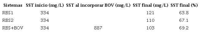 La prueba estadística (Tukey) dio como resultado que no hubo diferencia significativa de los SST obtenidos al final del tratamiento para los 3 sistemas (RBS1, RBS2, RBS+BOV). Ello significa que los componentes de esos sistemas (aireación, BRCrVI y BOV) no tienen efecto alguno en la remoción de los SST y que la eliminación de este parámetro depende, en su totalidad, del tiempo de reposo establecido (5 h).