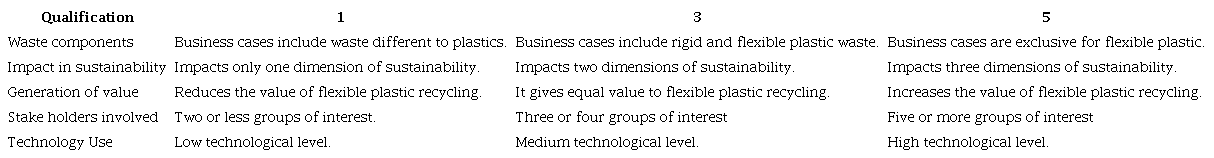 The business model research, about flexible plastic in circular economy was made through the different databases in Colombia and worldwide (Asia, Europe, Africa, Oceania, and the Americas). A comprehensive literature review was conducted utilizing the databases of ScienceDirect® and Scopus®, as well as relevant web pages, to identify pertinent research published between the years 2016 and 2023. The models found were evaluated and qualified according to the criteria shown in Table 1, based on the methodology approved by the Universidad Pontificia Bolivariana (UPB).