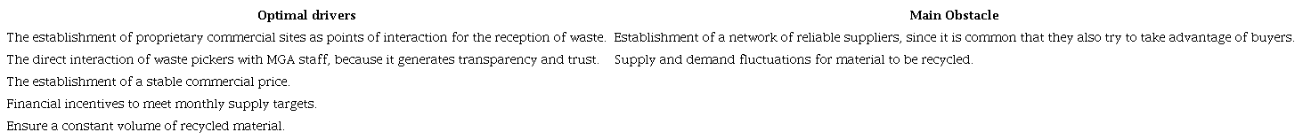 The company’s mobile application has a profile for each recycler where their productivity and reliability are recorded and analyzed. Recyclers who regularly trade with MGA are eligible for a loyalty program that awards a premium price in exchange for meeting monthly supply targets. In this way, and with the integration of other informal collectors such as scrap yard owners, the company maintains a relatively constant supply of waste, additionally, thanks to the interaction at commercial points, there is a certain degree of control over types and qualities of received materials, besides building trust, acceptance, and inclusion of the IRS (Gall et al., 2020).