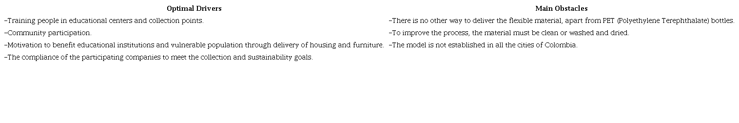 The process begins with the training of consumers in educational centers and collection points. The participants fill plastic bottles of Polyethylene Terephtalate (PET) with flexible post-consumer waste as tightly as possible, carrying them to the collection points and then to the processing plants in Medellín and Bogotá, where the plastic bottles “are broken to remove the content of flexible plastics. PET bottles are marketed with container manufacturing companies and the flexible packaging materials are mechanically bonded to later apply modifiers that reinforce their properties” (Rivas Salmón, 2019). The model also receives plastic surpluses from industry.