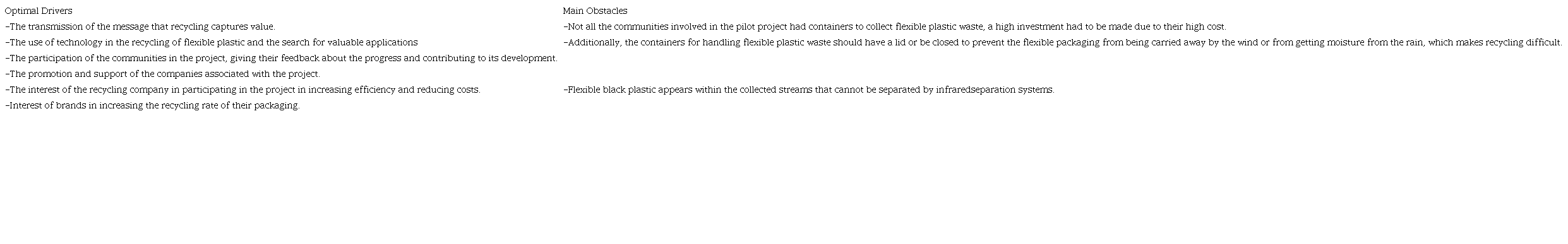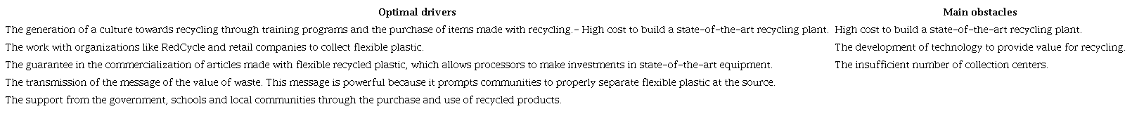 One primary obstacle hindering the valorization of recycled plastics is the persistently low rate of household plastic waste collection. This insufficient collection significantly reduces the availability of recyclable materials, thereby limiting the scale and economic viability of recycling operations (Burgess et al., 2021). The low collection of flexible plastics originated for multiple reasons, starting with an unsuitable design that does not allow recyclability and the generation of circular flows (Ellen MacArthur Foundation, 2017). Deficiencies in waste collection reverse logistics are due to: 1. Low prices and incentives for recyclers and consumers; 2. Lack of information on the location of collection centers; 3. Limited transportation infrastructure and few alliances with other companies; 4. Inefficiencies in the collection and recovery systems (Superintendencia de Servicios Públicos Domiciliarios, 2019); 5. Failures in communication to the consumers about recycling, consumption, and circularity issues that allow a correct separation at the source and maximum use of the waste (Cerantola, 2016); 6. The low regulations for waste disposal and the technical restrictions in flexible plastics recycling.