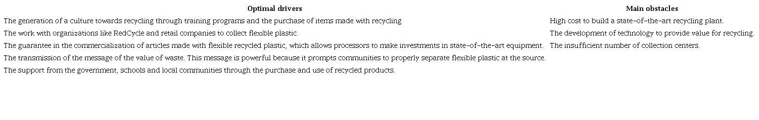 because it increases economic productivity, uses resources better and reduces waste, 2. Its ecological sustainability is high because by the separation of waste in the source it increases the collection of flexible plastic, 3. Its social impact is medium because, although it involved the community, it decreased jobs in the recycling company, 4. Its impact on the productivity of resources is high because it generated the recovery of 2000 tons of plastic and 5. Its impact at the level of technological innovation is medium because it requires the implementation of an infrared equipment to increase the separation (Sandford et al., 2020).