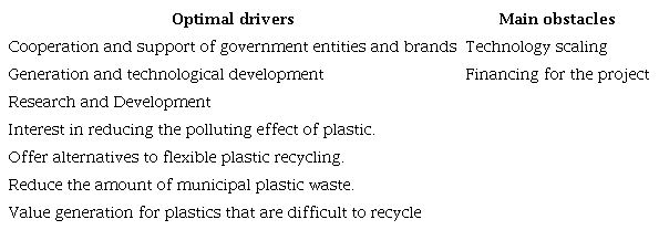 Within the guidelines of this business model, we found: 1. Its level of eco-efficiency is high due to the increase of up to 45 times the value of recycling, it allows offsetting the costs of processing; 2. Ecological sustainability is high because this model allows reducing the carbon footprint by 45 % versus polyurethane that is made with virgin resin and address the problem of products that are difficult to recycle mechanically; 3. The productivity of resources is low because the initial conversion rate is low due to the size of the plant pilot; 4. The social impact is high due to the generation of current and potential jobs; 5. Technological innovation is high because it develops novel technology that transforms plastic waste through chemical reactions.