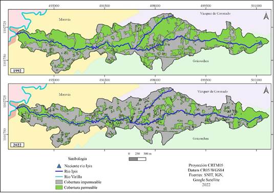 (Objective): This research analyzed the spatiotemporal dynamics of land cover change over a period of 30 years (1992-2022) in the urban micro-basin of the Ipís River in the Greater Metropolitan Area (GAM) of Costa Rica and evaluated the ecological condition of its riparian zones.