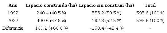 Los resultados del mapeo de coberturas impermeables y permeables se presentan en el Cuadro 3 y en la Figura 2. De los resultados más sobresalientes de este análisis fue el aumento del 66.6 % del espacio construido (coberturas impermeables) en el periodo estudiado, a expensas del espacio sin construir (coberturas con mayor nivel de permeabilidad).