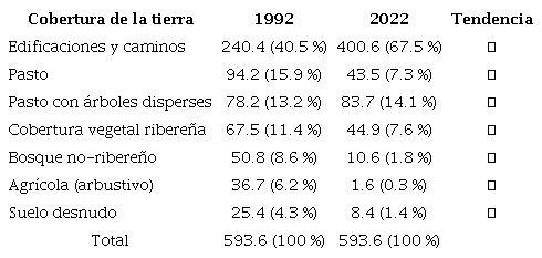 (Conclusiones): La expansión de coberturas asociadas a usos urbanos ha sido prominente en la microcuenca del río Ipís en las últimas tres décadas, y la alta degradación en sus zonas ribereñas compromete la capacidad de proveer servicios ecosistémicos en este contexto de alta alteración antropogénica.