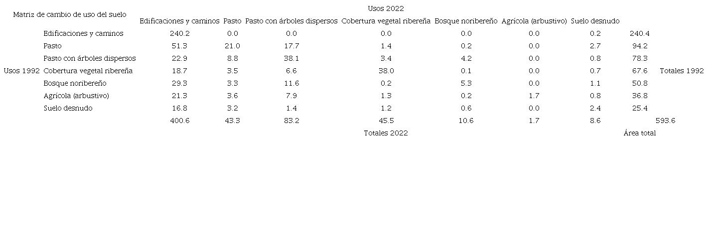 Análisis más detallados de las coberturas específicas y sus transiciones (Cuadro 5) respaldan el aumento significativo de las coberturas asociadas al uso urbano en la microcuenca. Sobre las transiciones, resalta la intrusión de coberturas impermeables a expensas de todas las otras coberturas, particularmente de pastos y pastos con árboles dispersos, así como de áreas ribereñas con vegetación y bosques no-ribereños. También hubo un porcentaje significativo de áreas agrícolas y suelo desnudo que transicionaron a coberturas impermeables. Así, de las 94.2 ha de pasto existentes en 1992, 51.3 ha (un 54 %) pasaron a coberturas impermeables en 2022. También, un 57 % del área total de parches boscosos no-ribereños en 1992 (29.3 ha) se perdieron a expensas de coberturas impermeables. En el caso la cobertura de pasto con árboles dispersos, a pesar de perder 22.9 ha de 1992 al 2022 a costa de coberturas asociadas a usos urbanos, mostró un crecimiento de 4.9 ha a expensas de otras categorías como parches boscosos no-ribereños, zonas agrícolas y pastos. Por ejemplo, los bosques no-ribereños perdieron un porcentaje importante del área a expensas de la cobertura de pastos con árboles dispersos. También, esta última cobertura tuvo una ganancia de 17.7 ha a expensas de pastos, algo que puede deberse a diversas dinámicas de uso de la tierra como terrenos “ociosos” que se dejan en abandono.