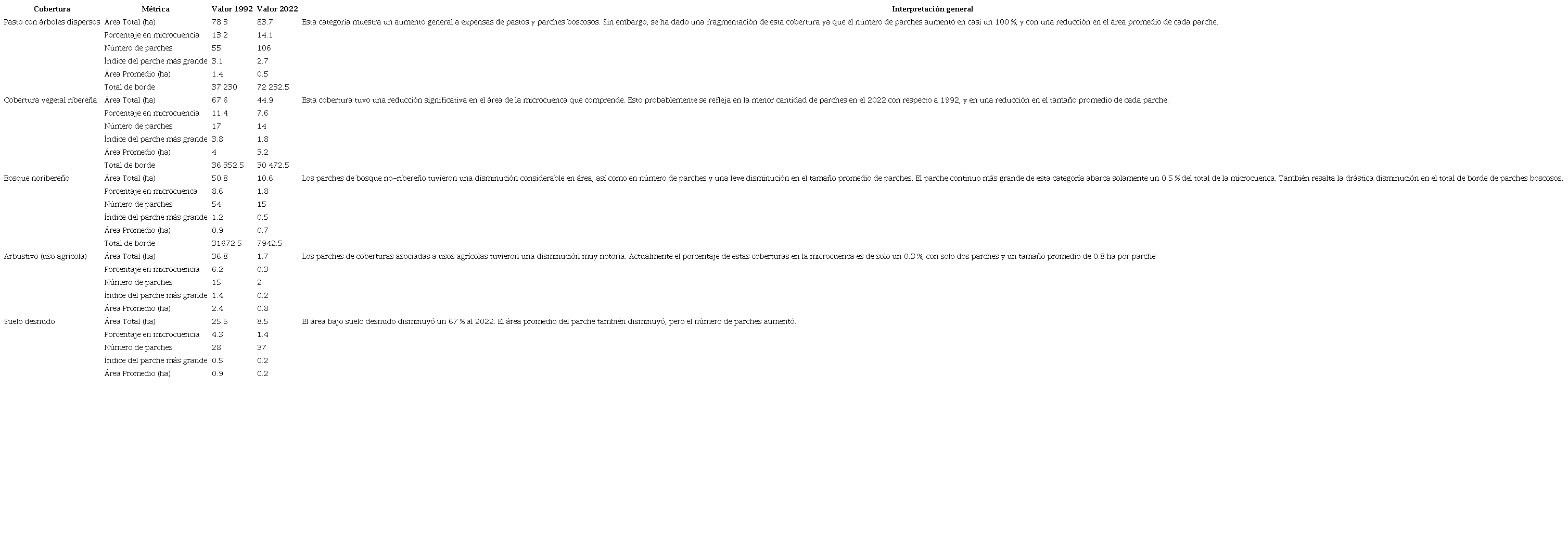 Otra consideración es la relación entre los cambios de cobertura de la tierra con la integridad ecológica de los ecosistemas ribereños. Si bien existe una relación clara entre los sistemas ribereños y las dinámicas de cambio de cobertura de la tierra que suceden en las cuencas asociadas (McAlpine & Wotton, 2007; Smith, 1992), aquí no se exploró a fondo esa relación. En este sentido, es crucial entender de manera más precisa la relación que tienen los cambios de cobertura de la tierra con la integridad ecológica de los sistemas ribereños en el contexto de la microcuenca. Para analizar esta relación, también es relevante considerar la escala. En este trabajo nos enfocamos en una escala de paisaje, a nivel de microcuenca. Sin embargo, es importante considerar la relación multiescalar de los sistemas socioecológicos; por ejemplo, cómo las dinámicas de esta microcuenca pueden incidir en otras cuencas funcionalmente interconectadas y viceversa.