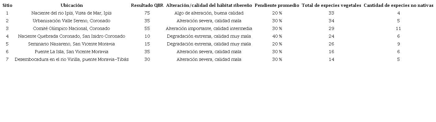 Como era de esperar, el sitio 1 presentó la mejor condición ecológica de todos según el índice (valor de 75), ya que corresponde a la naciente del río. Este sitio, ubicado entre la plaza de deportes de Vista de Mar en Ipís y una zona de potrero en San Isidro de Vázquez de Coronado, presenta parches de vegetación con una importante densidad de dosel, pero restringidos a las orillas del cauce, especialmente en el margen izquierdo. Este fue el sitio que contó con mayor diversidad de especies de árboles y mayor número de individuos por especie, especialmente nativas (Cuadro 7).