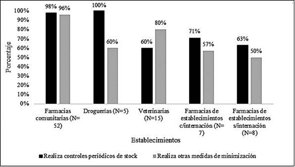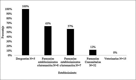 El tamaño de muestra por estrato resultante fue: 52 farmacias comunitarias; 7 establecimientos con internación, 8 establecimientos sin internación, 5 droguerías, 15 veterinarias. Los criterios de inclusión fueron establecimientos que accedían voluntariamente a participar y se encontraban habilitados por las autoridades sanitarias a la fecha de relevamiento, en la jurisdicción de Neuquén capital. Por otro lado, se excluyeron establecimientos no elegibles por falta de acceso a la persona responsable del lugar o sitios donde se comprometiera la calidad de respuesta por alguna razón.