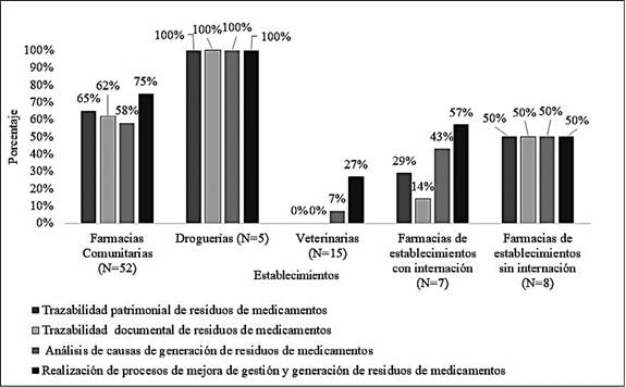 Según se observa en la Figura 5, las droguerías poseen mayor cumplimiento de trazabilidad, análisis de las causas de la generación de residuos y aplicación de procesos de mejora, mientras que los otros establecimientos lo hacen insuficientemente.