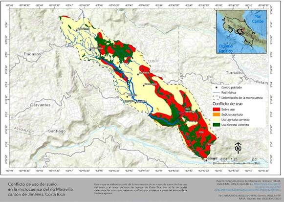La microcuenca del río Maravilla ubicada en el cantón de Jiménez, provincia de Cartago, enfrenta un importante proceso de conflicto de uso del suelo (Figura 1) producto de la deforestación asociada con monocultivos, ganadería y otras actividades en sitios que presentan categorías VI y VIII en capacidad de uso de suelo, los cuales deberían estar asociados con el uso y conservación forestal, impactando negativamente sus ecosistemas (Jiménez-Gavilán, 2021). Las características geomorfológicas y condiciones hidrometeorológicas de la zona aumentan la sedimentación y el riesgo de inundaciones, evidenciado en julio de 2021, con un evento natural asociado a las condiciones climatológicas extremas. La pérdida de bosques afecta también sitios de recreación y el acceso al agua potable, motivando al Área de Conservación Central (ACC) del Sistema Nacional de Áreas de Conservación (SINAC) a conseguir aliados para proponer un proceso de restauración para la vegetación riparia del río Maravilla. La Universidad Estatal a Distancia fue designada para desarrollar esta estrategia de priorización basada en servicios ecosistémicos para restaurar áreas clave.