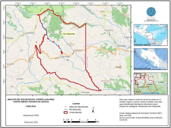 El río Maravilla se ubica en el distrito Juan Viñas, cantón de Jiménez. Este cantón posee un área de 287.4 km², representando un 10.8 % de la extensión total de la provincia de Cartago (3 125 km²), siendo el cuarto, en extensión, de los ocho cantones de la provincia, y el 42° en el nivel nacional, con una proyección de población de 7 106 personas, según el INEC (Municipalidad de Jiménez, 2023). En la Figura 2 se muestra el límite distrital y el sector de intervención en la investigación.
