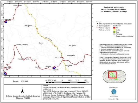 Con los datos anteriores, fue posible construir un contexto general de las posibles áreas prioritarias, a lo largo del área de protección del río, debidamente clasificadas entre alta, media y baja. En la Figura 3 se muestra el resultado espacial de la distribución de las prioridades de restauración en el río Maravilla, producto del análisis multicriterio citado anteriormente. El sitio conocido como Poza La Mica se caracteriza por ser un lugar utilizado históricamente para la recreación y el esparcimiento por parte de los vecinos que habitan en el cantón de Jiménez, haciendo de este un sitio de alta prioridad.