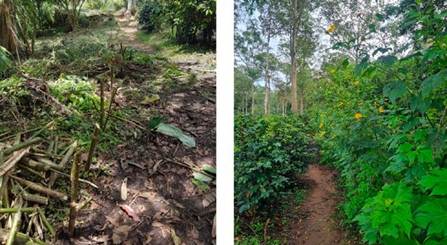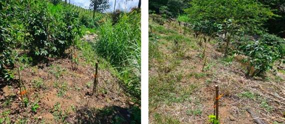 En la siembra directa entre cultivos de café, se utilizó el arbusto Hamelia patens (coralillo), apetecido por insectos, mariposas y aves, y especies melíferas (Torres, 2009), esta especie se utiliza en pendientes onduladas o escarpadas, suelos pedregosos y compactados, tolerando grandes cantidades de lluvia. También se utilizaron otras especies como Senecio multivenius, Triumfetta lappula, Monochaetum floribundum y Psidium guajava.