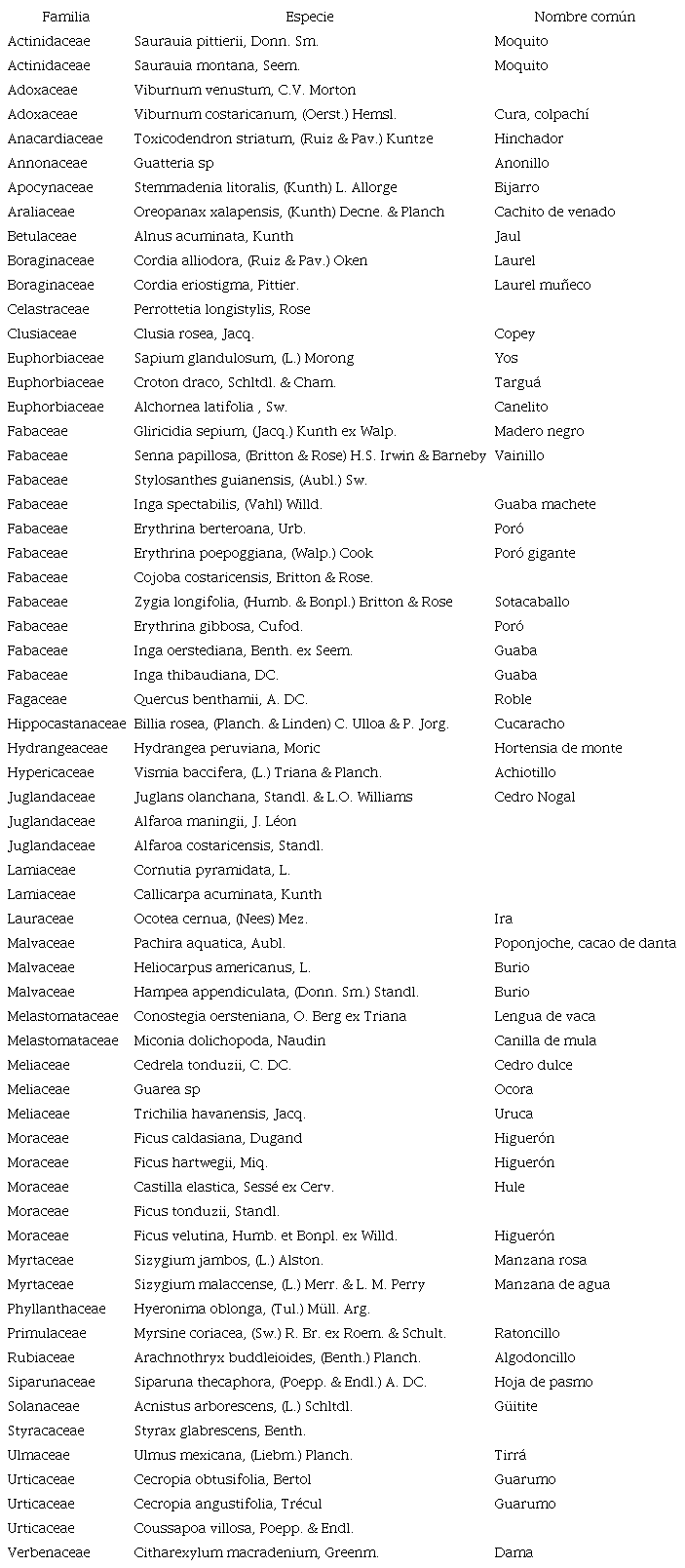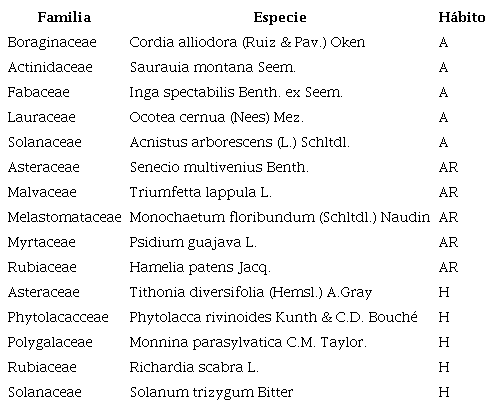 Entre las técnicas de al azar, zigzag y tresbolillos se utilizó Acnistus arborescens, un árbol de crecimiento rápido que brinda sombra es utilizado para cercas vivas, ayuda al control de la erosión y sus frutos y flores son muy apetecidos por aves y polinizadores (Aximoff et al., 2020). Otras especies utilizadas fueron Gliricidia sepium, Erythrina berteroana, Cecropia obtusifolia, Cordia alliodora, Saurauia montana, Inga spectabilis y Ocotea cernua. Que, de acuerdo con Rondón y Vidal (2005), citado por Sanchún (2016), por sus características morfológicas y ecofisiológicas se deben considerar al seleccionar las especies para procesos de restauración.