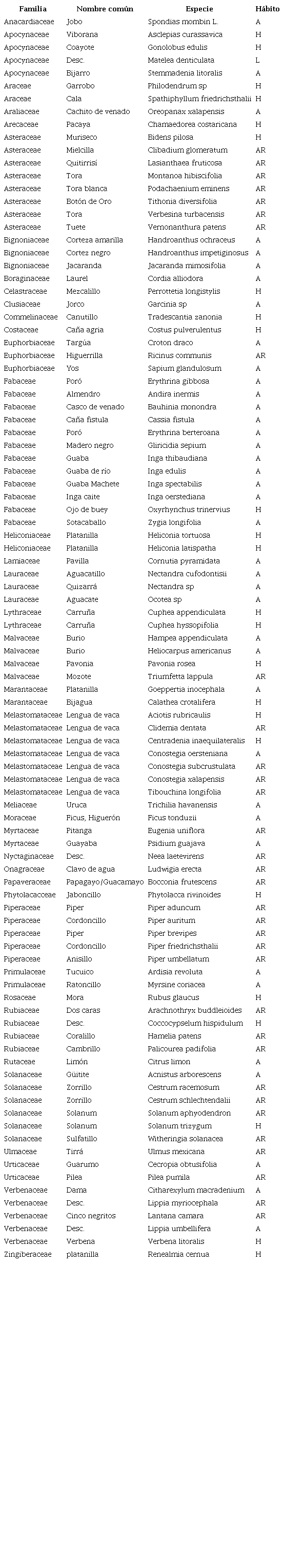 Los sitios fueron rehabilitados con especies nativas de la zona. La selección de ellas se dio producto del muestreo y la ubicación de los sitios de referencia, con base en esta información se plantaron 39 especies de árboles (A), 33 especies de arbustos (AR), 24 especies de herbáceas (H) y una Liana (L), para un total de 97 especies y 37 familias. Las familias con mayor representatividad corresponden a Fabaceae, Asteraceae, Melastomastaceae y Solanaceae, como se puede observar en el Cuadro 3.