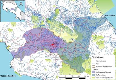 La cuenca del Río Grande de Tárcoles se ubica en las regiones Central y Pacífico Central de Costa Rica. Se extiende en un área de 2 165.99 km2 equivalente a un 4.2 % de la superficie del país (Figura 1). El área incluye doce áreas silvestres protegidas en dos áreas de conservación, 38 municipalidades (la mayoría situadas en la Gran Área Metropolitana-GAM). Incluye además dos subcuencas principales: Río Virilla y Río Grande de San Ramón, y aproximadamente 22 microcuencas; es de gran importancia para el desarrollo nacional porque son recursos de agua para consumo humano, irrigación, potencial hidroeléctrico, entre otros. Con un 53 % de la población de Costa Rica viviendo en el área, con un 80 % de la actividad industrial y un 50% de la producción de café ubicada en esta zona, al Grande de Tárcoles se le ha calificado como uno de los ríos más contaminados de Centroamérica (Rojas, 2011).