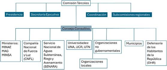 “a) el Ministerio de Ambiente y Energía (MINAE) a través del Sistema Nacional de Áreas de Conservación, quien la preside; b) el Ministerio de Agricultura y Ganadería (MAG); c) el Ministerio de Salud (MINSA); d) la Compañía Nacional de Fuerza y Luz (CNFL); e) el Servicio Nacional de Aguas Subterráneas, Riego y Avenamiento (SENARA); f) la Universidad Nacional (UNA); g) la Universidad de Costa Rica (UCR); h) la Universidad Técnica Nacional (UTN); i) los municipios involucrados; j) las organizaciones no gubernamentales; k) las organizaciones locales; y l) la Defensoría de los Habitantes de la República (DHR), que participará como fiscal” (Figura 2).
