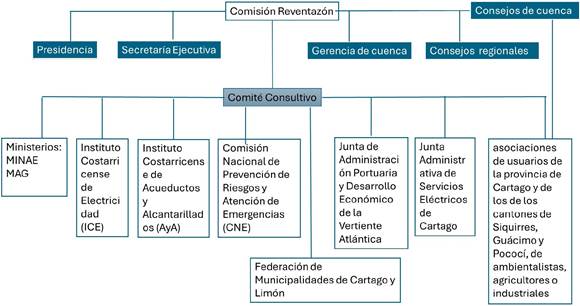 “a) El ministro o la ministra de Ambiente y Energía o su representante de nivel superior; b) El ministro o la ministra de Agricultura y Ganadería o su representante de nivel superior; c) El presidente ejecutivo o la presidenta ejecutiva del Instituto Costarricense de Electricidad o su representante de nivel superior; d) El presidente ejecutivo o la presidenta ejecutiva del Instituto Costarricense de Acueductos y Alcantarillados o su representante de nivel superior; e) El presidente o la presidenta de la Comisión Nacional de Prevención de Riesgos y Atención de Emergencias o su representante de nivel superior; f) EI presidente ejecutivo o la presidenta ejecutiva de la Junta de Administración Portuaria y Desarrollo Económico de la Vertiente Atlántica o su representante de nivel superior; g) El gerente o la gerenta de la Junta Administrativa de Servicios Eléctricos de Cartago o su representante de nivel superior; h) Una persona representante de la Federación de Municipalidades de Cartago; i) Una persona representante de la Federación de Municipalidades de Limón, en representación de los cantones de Siquirres, Guácimo y Pococí; j) Una persona representante de las asociaciones de usuarios de la provincia de Cartago, de ambientalistas, agricultores o industriales, que formen parte del consejo de cuenca y sean designados por este; k) Una persona representante de las asociaciones de usuarios de los cantones de Siquirres, Guácimo y Pococí, de ambientalistas, agricultores o industriales, que formen parte del Consejo de cuenca y sean designados por este” (Figura 3).