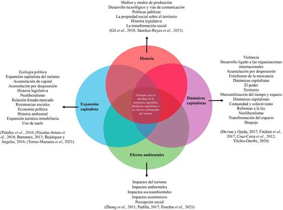 En los trabajos que abordan el turismo y las dinámicas capitalistas, los enfoques disciplinarios destacados son la geografía crítica, la economía política, la ecología política y las ciencias ambientales, por lo que también la teoría aportada es de tendencia crítica, en cuanto que se apoyaron en temas como la desposesión, la violencia en el turismo, la acumulación originaria y la acumulación por desposesión.