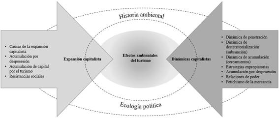 En cuanto a la primera, la expansión capitalista, se puede explicar a través de las categorías de análisis: causas de la expansión capitalista, acumulación por desposesión, acumulación de capital por el turismo y resistencias sociales. Por otro lado, las dinámicas capitalistas se pueden explicar mediante las categorías de análisis: dinámica de penetración, dinámica de desterritorialización y dinámica de acumulación (Monterroso, 2020). Vilchis et al., (2016) las denominan: dinámicas de penetración, dinámicas de subsunción y dinámicas de cercamientos. Igualmente, este tópico podría comprenderse con las estrategias expropiatorias de Composto y Navarro (2014); además, con la acumulación por desposesión, las relaciones de poder y el fetichismo de la mercancía. Todo se interconecta a través de líneas indicadoras de que el fenómeno de dicha realidad por estudiar está integrado por tópicos, categorías y criterios de análisis sin separación; el resultado final del análisis de esta interrelación ayudará a explicar los efectos ambientales del turismo.