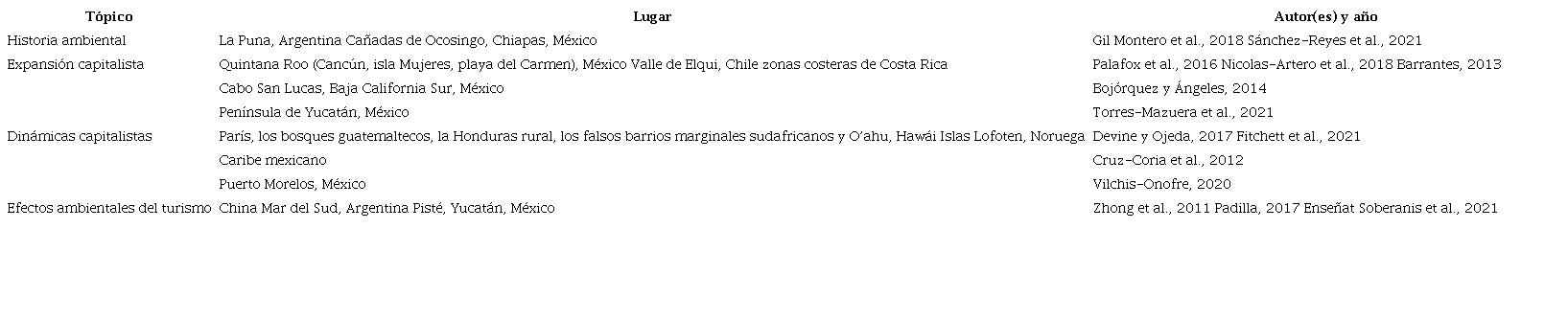 La selección de los trabajos revisados se basó en casos de estudio empíricos en ámbitos turísticos, tomando en cuenta la historia ambiental, la expansión capitalista, las dinámicas capitalistas y los efectos ambientales del turismo, por lo que se utilizaron, también, dichas palabras clave en su búsqueda. De los trabajos identificados, se revisaron los aportes teóricos y metodológicos empleados, con especial énfasis en la determinación de tópicos y categorías análiticas utilizadas. En el Cuadro 1, se presentan los estudios examinados, por tópico, lugar, persona autora y año.