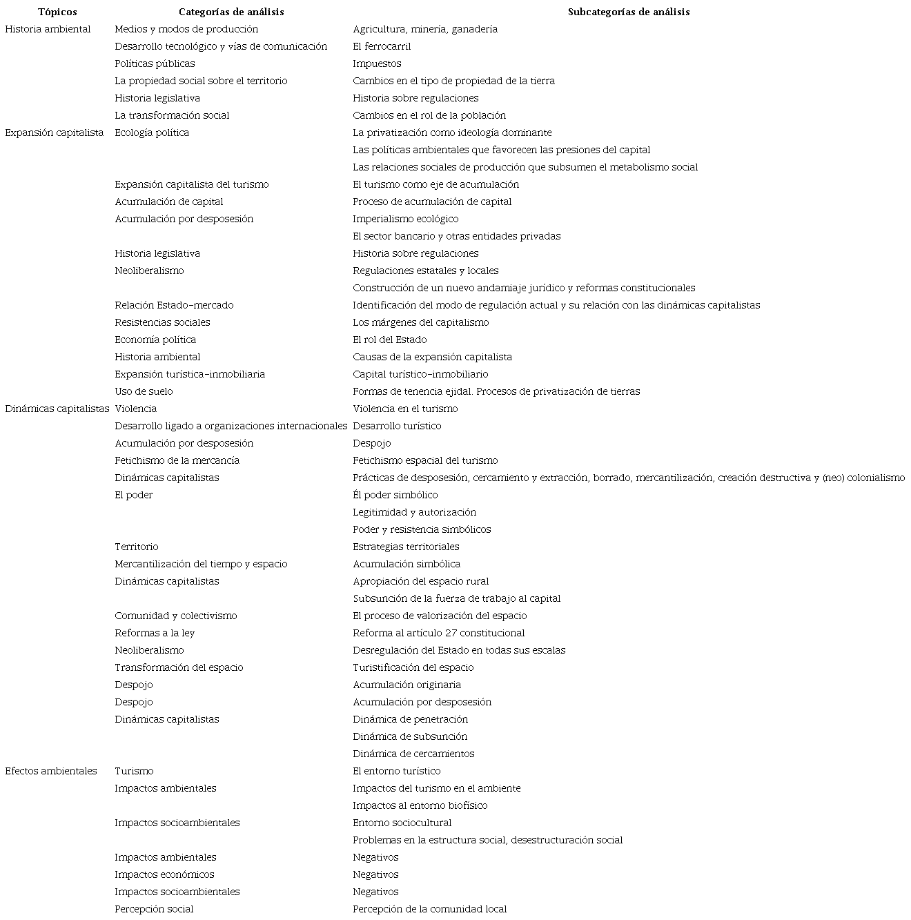 A partir de la detección de los tópicos, posteriormente se identificaron diversas categorías de análisis, por parte de la expansión capitalista: las causas de la expansión capitalista, la acumulación por desposesión, la acumulación de capital por turismo y resistencias sociales. Sobre las dinámicas capitalistas, se contemplaron: dinámica de penetración, dinámica de desterritorialización (subsunción), dinámica de acumulación (cercamientos), estrategias expropiatorias, acumulación por desposesión, relaciones de poder y fetichismo de la mercancía.