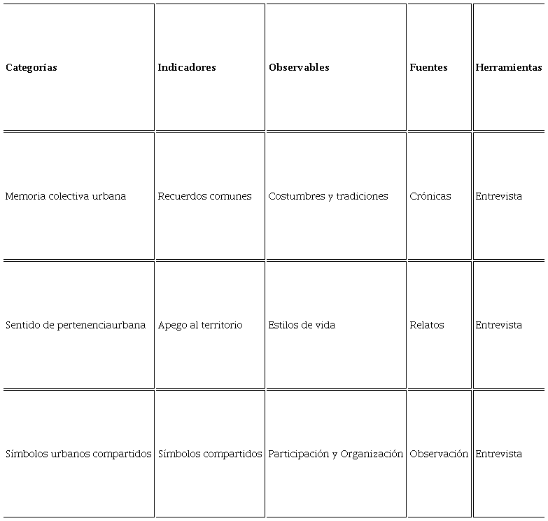 Priorizando el manejo de los contenidos teóricos se permite establecer un sistema conceptual de categorías que ayudan a determinar la estructura general para el abordaje de la identidad colectiva; no obstante, es pertinente recordar que los elementos propuestos son comprendidos dentro del espacio urbano, que es reconfigurado constantemente a través del tiempo, bajo el supuesto de la prevalencia de símbolos y conductas compartidas, que pueden presentar influencias y modificaciones por parte de otros contextos. En ese sentido, los ejes rectores de la identidad pueden entenderse como vínculos en continuo movimiento. A continuación se presentan los procesos metodológicos para cada exploración dimensional: