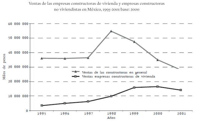 A pesar de que México enfrentó una crisis económica en los años 90, se obtuvo un crecimiento apreciable de las ventas de las empresas desarrolladoras de vivienda, así como su consolidación, mientras caían debido a la competencia por la creación de nuevas empresas constructoras hasta llegar a un pico de construcción nacional en el año 1998, el cual puede apreciarse en la figura 2.