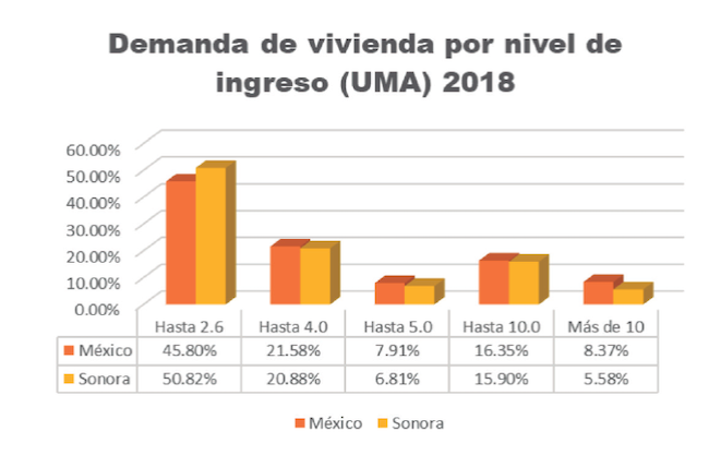 El INFONAVIT registra una demanda potencial nacional de poco más de 6.8 millones de créditos para vivienda en el año 2018, de los cuales el 45.8% corresponde a personas con ingresos menores a 2.6 UMA (aproximadamente $6,700 mensuales); para el estado de Sonora esta proporción es mayor y supera el 50% de los créditos. Esto pone en evidencia que este segmento de población de menores ingresos compone ampliamente la mayor parte de las necesidades de apoyo para adquirir vivienda, mientras que los segmentos de mayor capacidad adquisitiva representan cerca del 24% de la demanda a escala nacional, y el 21% en Sonora. Debe notarse que, aunque es el segmento de menor volumen, también es el de mayor impacto, pues necesitan créditos más elevados.