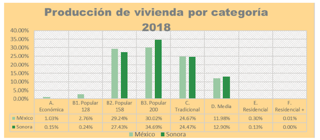 Este instituto registra que el año 2018 se registraron cerca de 210,000 viviendas en el país, cifra muy baja en comparación con la demanda potencial; además, en la gráfica se puede aprecia que la producción de vivienda económica y popular de hasta 128 UMA (poco más de $328,000) a escala nacional es menor del 4% del total, y mucho menor del 1% en el estado de Sonora, mientras que los estratos de vivienda entre popular 200 y media componen prácticamente dos terceras partes de la producción nacional y hasta casi 72% en Sonora.